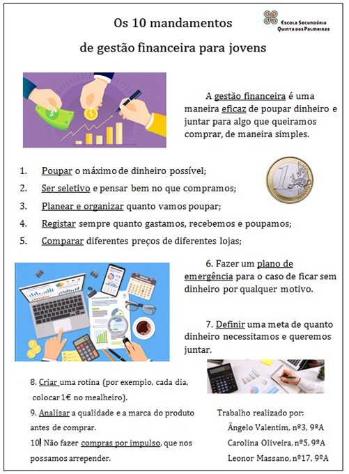 No âmbito da Disciplina de Cidadania e Desenvolvimento, na abordagem ao tema Literacia Financeira e Educação para o Consumo, foi proposto aos alunos das turmas do 9.º ano a realização de um poster com “Dez mandamentos da gestão financeira para jovens”.
