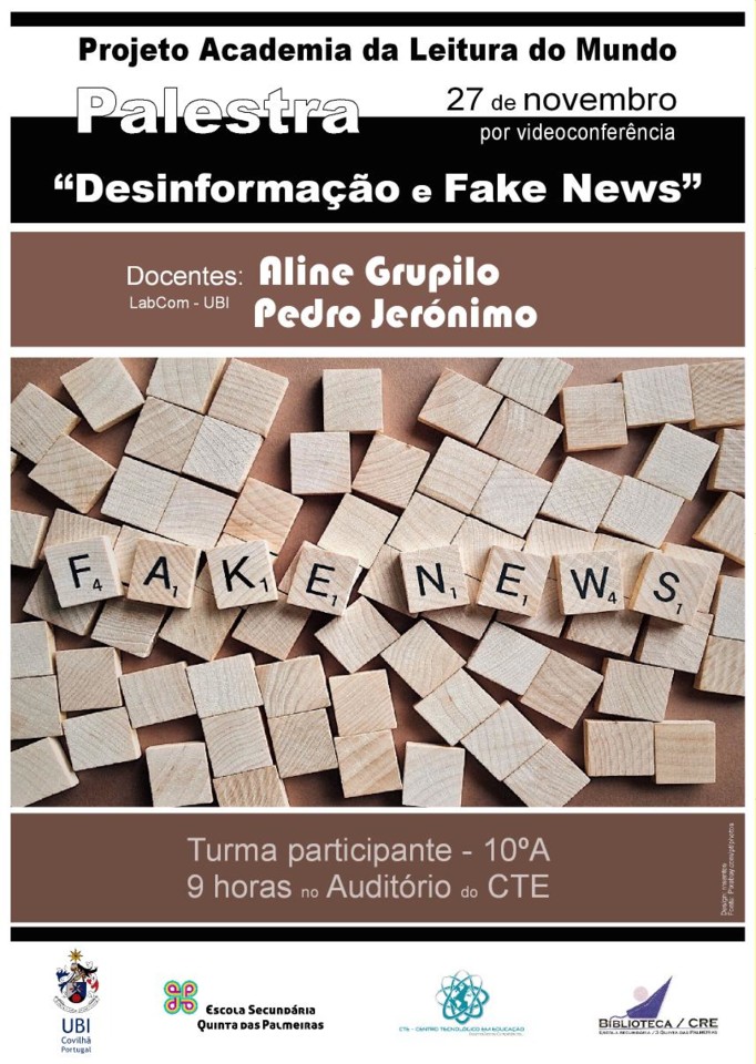 No dia 27 de novembro, a turma A do 10º ano assistiu por videoconferência, à palestra “Desinformação e Fake News”, no âmbito do projeto “Academia da Leitura do Mundo”. Uma vez que esta atividade decorreu na hora da aula de Português, fomos espreitar o Diário da Turma e, com a autorização da aluna que fez o registo, deixamos aqui a página escrita neste dia.